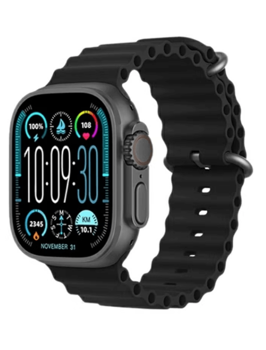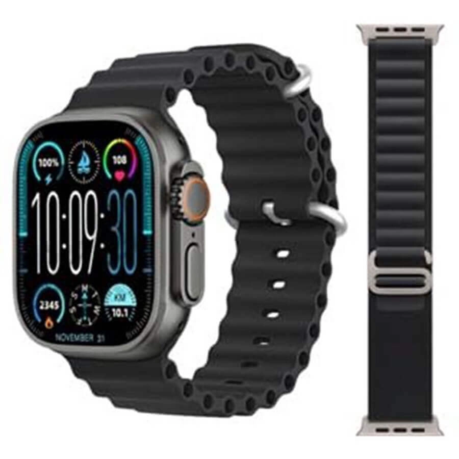 تصميم Ultra المميز: تأتي بتصميم مشابه تماماً لساعة Apple Watch Ultra مع هيكل متين وشاشة كبيرة واضحة (Full Screen).