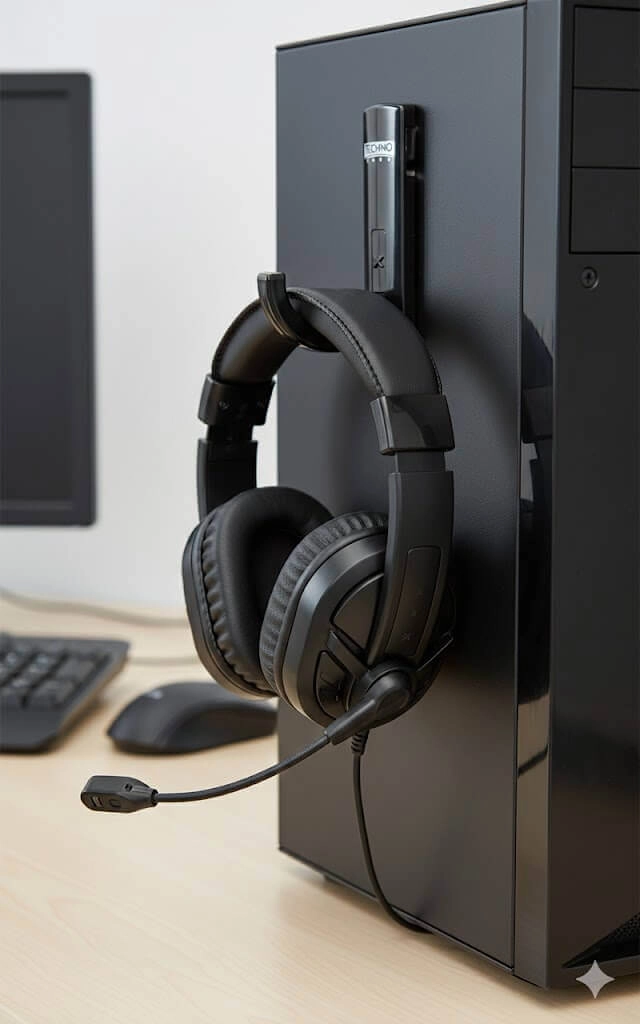 توفير المساحة: تصميم ذكي يسمح لك بتعليق سماعة الرأس مباشرة على جانب الشاشة، مما يحافظ على ترتيب مكتبك ويوفر مساحة إضافية.