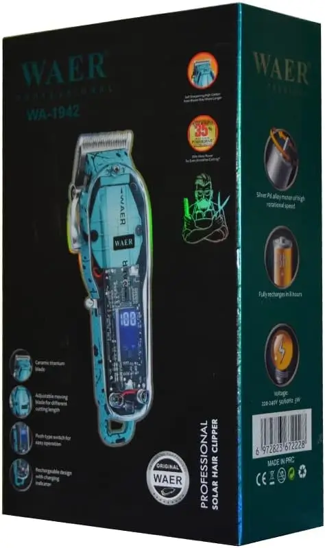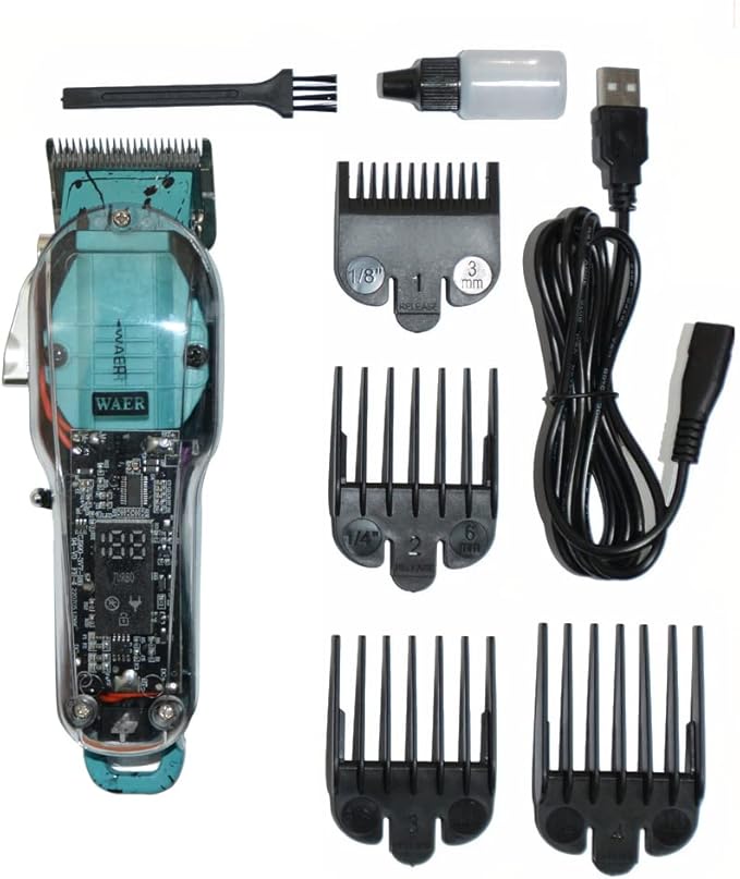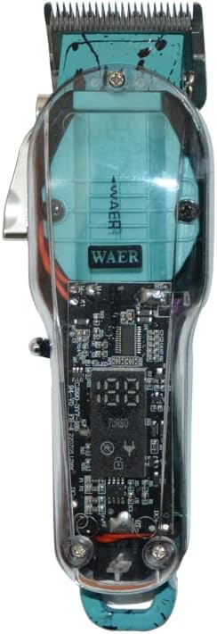 استمتع بتجربة حلاقة صالونات التجميل في منزلك مع ماكينة WAER المتميزة بتصميمها الشفاف الذي يظهر التفاصيل التقنية القوية.
